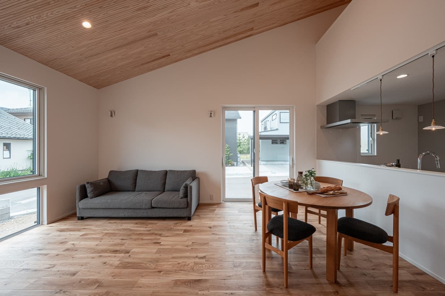 ・勾配&羽目板の天井で、木のぬくもりを感じる広々リビング